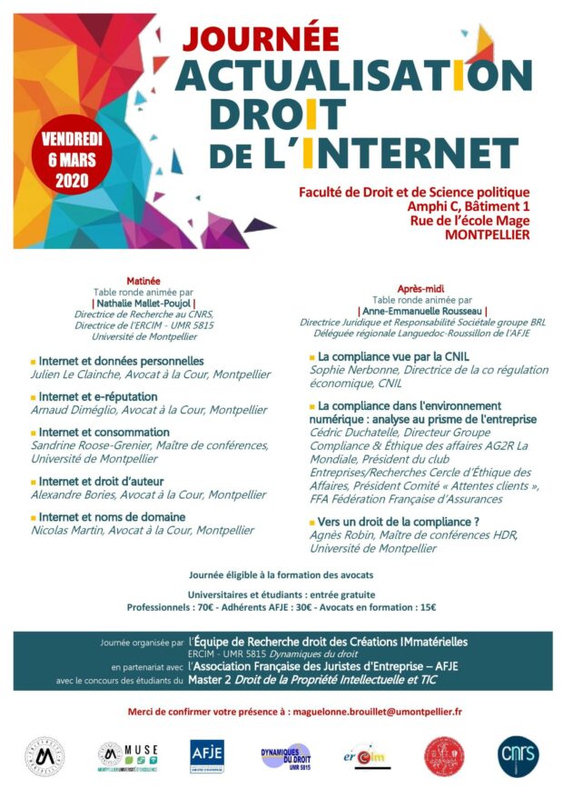 Le 6 mars 2020, mon Master fut chargé d’organiser le colloque annuel, rattaché aux créations immatérielles, de l’Université de Montpellier. Le thème de cette année fut « le Droit de l’Internet » auquel ont participé de nombreux intervenants, avocats, juristes, membres de la CNIL…